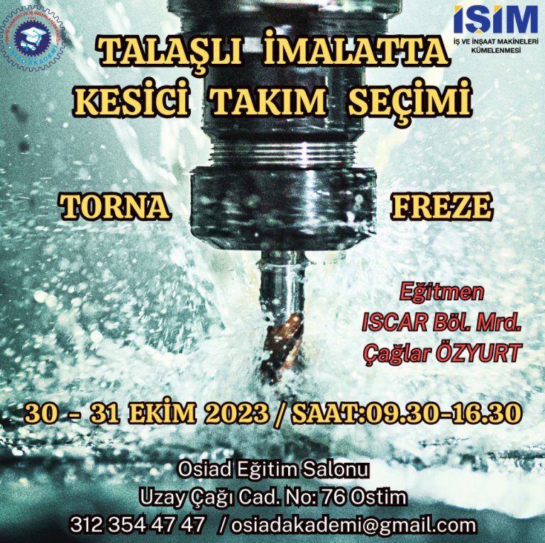 OSİAD Akademi ve İŞİM Kümelenmesi işbirliği ile düzenlenen Talaşlı İmalatta Kesici Takım Seçimi Eğitimi 30-31 Ekim saat 09.30-16.30 saatleri arasında (2 gün) Eğitmen Çağlar ÖZYURT tarafından OSİAD Eğitim Salonunda gerçekleştirilecektir.