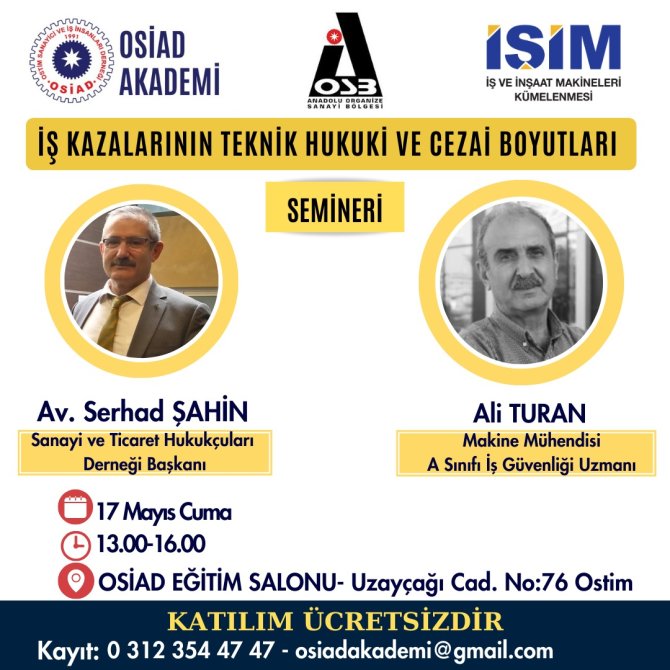 OSİAD Akademi, Anadolu OSB ve İŞİM Kümelenmesi’nin ortak düzenlediği “İş Kazalarının Teknik, Hukuki ve Cezai Boyutları” semineri 17 Mayıs 2024 Cuma günü 13.00-16.00 saatleri arasında Sanayi ve Ticaret Hukukçuları Derneği Başkanı Av. Serhad ŞAHİN ve A Sınıfı İş Güvenliği Uzmanı Ali TURAN tarafından OSİAD Eğitim Salonunda ücretsiz olarak verilecektir.