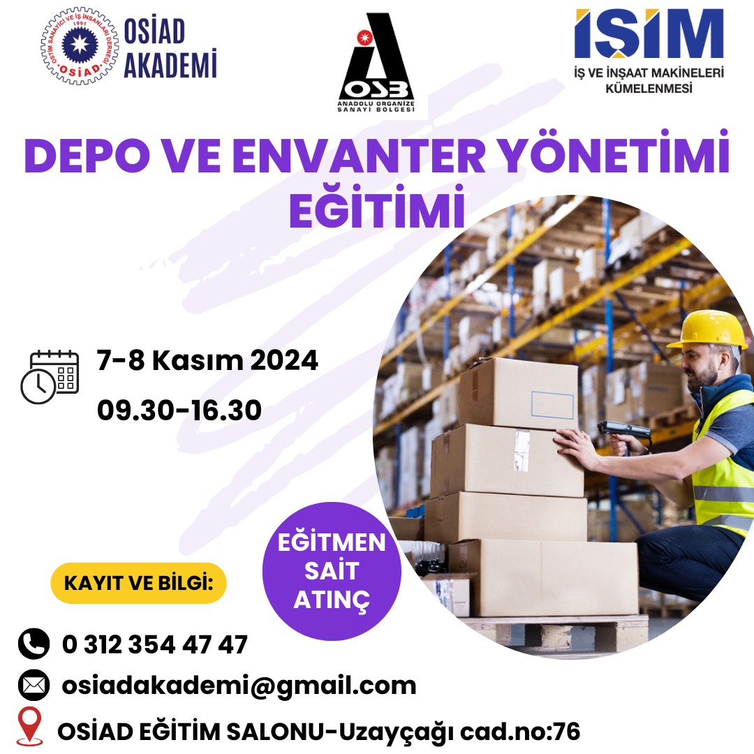 OSİAD Akademi, Anadolu OSB ve İŞİM Kümelenmesi iş birliğiyle düzenlenen “Depo ve Envanter Yönetimi” eğitimi, eğitmen Sait Atınç tarafından 7-8 Kasım tarihlerinde (2 gün) OSİAD eğitim salonunda düzenlenecektir. Katılım sınırlıdır. Başvuru sırasına göre kayıt yapılacaktır. Kayıt ve bilgi için: 0 312 354 47 47 / osiadakademi@gmail.com