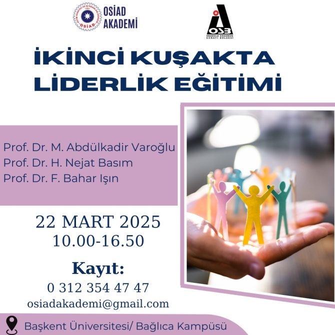 OSİAD Akademi ve Anadolu OSB iş birliğiyle düzenlenen “İkinci Kuşakta Liderlik Eğitimi”, Prof. Dr. M. Abdülkadir Varoğlu, Prof. Dr. H. Nejat Basım ve Prof. Dr. F. Bahar Işın tarafından 22 Mart 2025 Cumartesi günü 10:00-16:50 saatleri arasında Başkent Üniversitesi Bağlıca Kampüsü’nde düzenlenecektir. Katılım sınırlıdır. Başvuru sırasına göre kayıt yapılacaktır. Kayıt ve bilgi için: 0 312 354 47 47 / osiadakademi@gmail.com