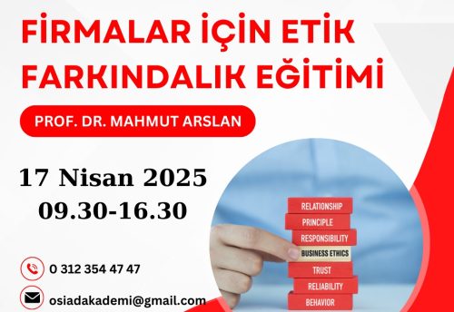 OSİAD Akademi, TOSYÖV, Anadolu OSB iş birliği ile düzenlenen “Firmalar İçin Etik Farkındalık” eğitimi, eğitmen Prof. Dr. Mahmut Arslan tarafından 17 Nisan Perşembe günü (1 gün) 09:30-16:30 saatleri arasında OSİAD Eğitim Salonunda düzenlenecektir. Katılım sınırlıdır. Başvuru sırasına göre kayıt yapılacaktır. Kayıt ve bilgi için: 0 312 354 47 47 / osiadakademi@gmail.com
