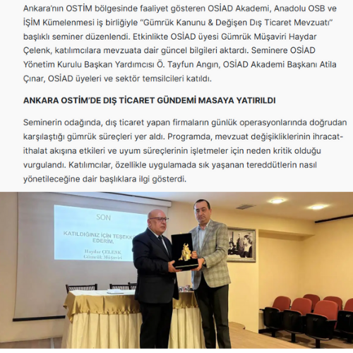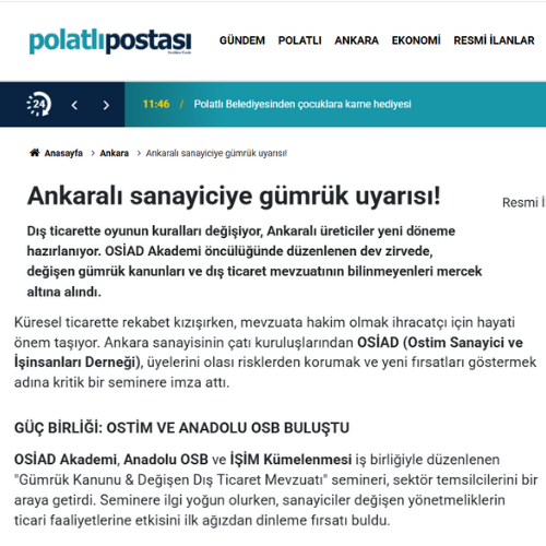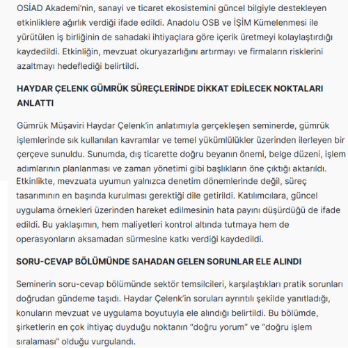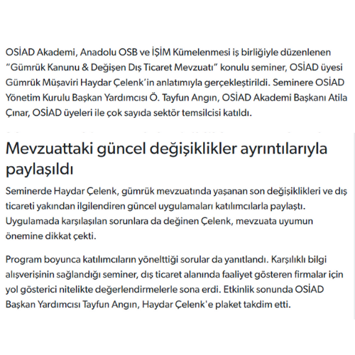 OSİAD TARAFINDAN DÜZENLENEN “GÜMRÜK KANUNU & DEĞİŞEN DIŞ TİCARET MEVZUATI” SEMİNERİ, BASINDAN İLGİ GÖRDÜ.