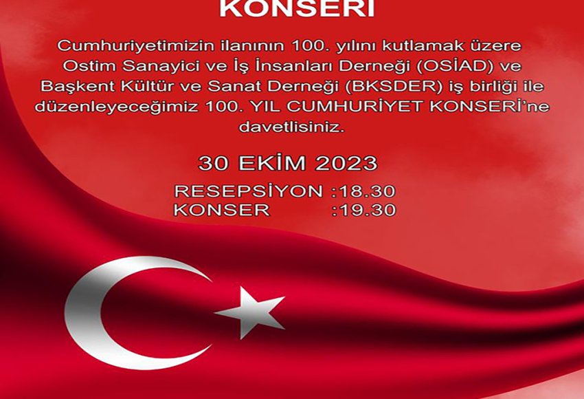 Cumhuriyetimizin ilanının 100. yılını kutlamak üzere Ostim Sanayici ve İş İnsanları Derneği (OSİAD) ve Başkent Kültür ve Sanat Derneği (BKSDER) iş birliği ile düzenleyeceğimiz 100. YIL CUMHURİYET KONSERİ’ne davetlisiniz. Tarih : 30 EKİM 2023Resepsiyon : 18.30Konser : 19.30Yer: Nazım Hikmet Kültür Merkezi/Yıldız Kenter Salonu ve Fuaye Alanı Not: Misafirlerimizin koyu […]